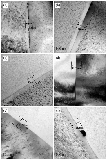 Figure 5 shows the PFZ of alloys AA and AZ under different aging conditions. According to the measured width of the PFZ, we found that the PFZ of alloy AA and AZ all became wider with the increase of aging time. Moreover, compared to alloy AA, the PFZ of alloy AZ was broader. However, for the alloy AZ, we can observe from Figure 5d,f that the width of PFZ is small, only increasing by 4.2 nm after reaching the over aged condition. This is due to the fact that the density of precipitates for alloy AZ was higher than for alloy AA (see Table 3), and more solute atoms were consumed during the growth of precipitates after peak aging, which hindered the segregation of solute atoms along grain boundary, thereby reducing the probability of PFZ broadening [23].