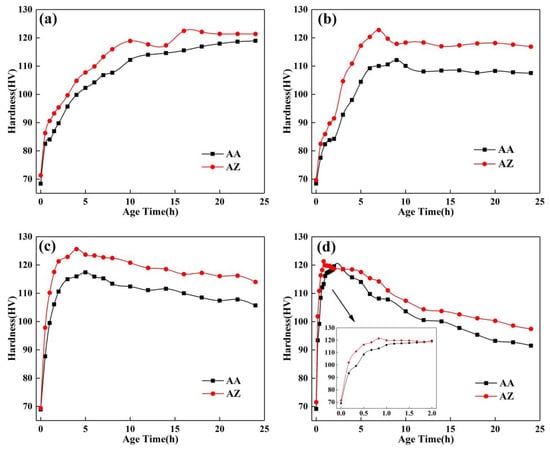 Age hardening curves of the alloy AA and AZ at different temperatures: (a) 150 °C, (b) 170 °C, (c) 190 °C, and (d) 210 °C.