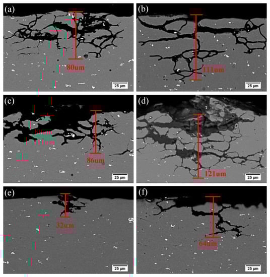 SEM morphologies of IGC and the maximum corrosion depth of alloy AA and AZ under different aging conditions at 170 °C (a,c,e) alloy AA, (b,d,f) alloy AZ, (a,b) under aged state, (c,d) peak aged state, and (e,f) over aged state.