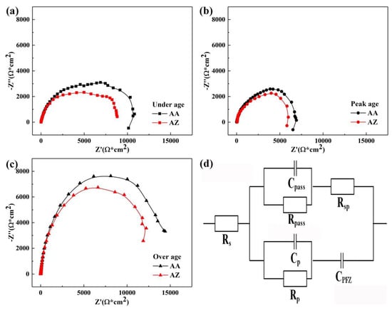 The Nyquist plots of alloy AA and AZ at different aged conditions are shown in Figure 11. The equivalent circuit for EIS test is shown in Figure 11d. The physical meaning of the circuit elements is described as follows: Rs is the resistance of the electrolyte, Rpass is the resistance of the oxide film, Cpass is the capacitance of the oxide film, Rsp is the resistance of the second phases Rp is the ohmic resistance of the precipitates, Cp is the capacitance of the precipitates and CPFZ is the capacitance of the PFZ. The parameters of EIS are shown in Table 7. We can roughly derive that the corrosion susceptibility of alloy AZ was higher than that of alloy AA, due to the fact that the diameter of the capacitive reactance arcs of alloy AA were all larger than for alloy AZ at the different aging states. The diameter of capacitive reactance arcs was largest for the over aged state, and was lowest for the peak aged state both for alloys AA and AZ, leading to the best corrosion properties at over aged state, and the worst corrosion properties at peak aged state. Furthermore, according to the literature [18], we know that a system with lower capacitances and higher resistances (ignore Rs) can obtain better corrosion resistance. We can find that the resistance of alloy AZ with 0.2% Zn addition was lower and the capacitance was higher than for alloy AA. Further analysis of the parameters shown in Table 7 will be carried out later on.