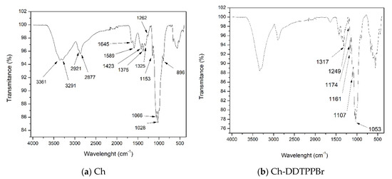 Fourier-transform infrared spectroscopy, FT-IR for the materials: (a) Ch and (b) Ch-DDTPPBr.