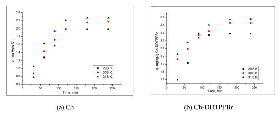 Thus, in order to evaluate the influence of pH onto the adsorption capacity, samples of ~0.1 g of adsorbent material were weighed, over which 25 mL of AgNO3 solution containing 10 mg Ag/L with pH values in the range of 1–12 was added. The pH of the solution was adjusted with buffer solutions and measured using an METTLER TOLEDO Seven Compact S210 pH meter (Mettler Toledo, Columbus, Ohio, SUA). The samples were kept in contact for 120 min, then filtered and the residual concentration of Ag (I) in the solutions was determined by atomic absorption spectrometry, using a Varian SpectrAAS 280 FS atomic absorption spectrophotometer (Varian, Palo Alto, California, SUA). To determine the influence of the contact time and the temperature onto the adsorption process, the contact time was varied between 30 and 240 min, at three temperatures (298 K, 308 K, and 318 K). Studies were carried out with an initial solution of Ag (I) of 10 mg/L at pH ~2. The amount of material used was ~0.1 g and the residual concentration of Ag (I) in the solutions was determined by atomic absorption spectrometry. To determine the equilibrium concentration and the effect of the initial concentration of Ag (I) on the adsorption capacity of the material, solutions of Ag (I) with different concentrations were prepared (10, 50, 75, 100, 150, 200, 300, 400, 500, and 600 mg/L) for chitosan and for the Ch-DDTPPBr (10, 50, 75, 100, 150, 200, 300, 400, 500, 600, 700, 800, and 900 mg/L). These were obtained by dilution from a stock solution of 1000 mg/L AgNO3. Adsorption was performed at a pH ~2 for 1 h and at 298 K.