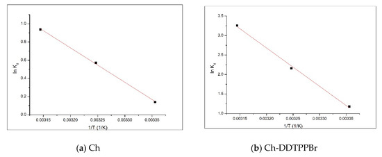 For the studied adsorption processes, the activation energy has a value of 21.8 kJ/mol for the adsorption of Ag (I) on Ch, with a correlation coefficient of 0.9904, and 28.4 kJ/mol for the adsorption of Ag (I) on the Ch-DDTPPBr with a correlation coefficient of 0.9925. Based on the value of the activation energy it can be concluded that the adsorption Ag (I) on the studied materials is a physical adsorption because the value of the activation energy is bigger than 8 kJ/mol [41,42].