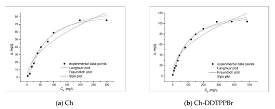 To determine the maximum adsorption capacity of the Ch-DDTPPBr material comparatively with Ch, the experimental data was modeled using the Langmuir [33], Freundlich [34], and Sips isotherm [35].