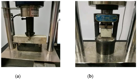 The three-point flexural test and compressive test were conducted on a universal testing machine (Wuxi Construction Instrument Manufacturing, Wuxi, China) of 300 kN capacity according to Chinese Standard GB/T17671-1999, as shown in Figure 2. First, the prism specimen with the span length of 100 mm was loaded in the middle span to measure the flexural strength (Figure 2a). The loading rate was 50 N/s. Afterwards, the two parts of each fractured prism specimen were placed on the test setup with an area of 40 mm × 40 mm (Figure 2b) to test compressive strength at a loading rate of 2.4 kN/s. The average flexural strength and compressive strength were determined by the three samples of each group.