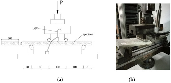 The four-point bending test was conducted on an electronic universal testing machine (SANS, MTS Industrial systems (China), Shenzhen City, China) of 50 kN capacity. The span of 300 mm was equally divided into three parts. The loading was controlled by displacement with a rate of 0.1 mm/min. Two linear variable displacement transducers (LVDTs) were mounted at the midspan to measure deflection (Figure 3). The readings of load and LVDTs were collected by data logger once per second.