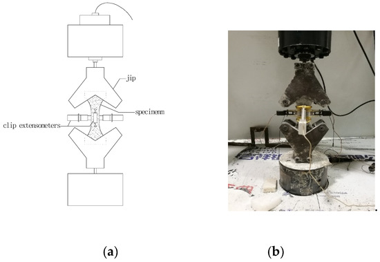 The axial tensile test was conducted on the MTS universal testing machine with a loading rate of 0.001 mm/s. Four clip extensometers were mounted at the middle segment of the specimen to measure the longitudinal and transverse elongation (Figure 4). The load and deformation were automatically recorded by MTS. The results are the average of valid samples for each series. Only the results of specimens failed in the gauge length and without eccentricity were employed. In this case, at least two results should be valid and the deviation should be less than 30% for each series; otherwise, the test of this series was repeated.