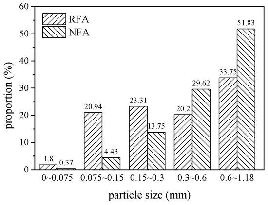 Figure 5 shows the photos of the two kinds of fine aggregate. As can be seen, the surface of RFA is angular and rough, while that of NFA is comparatively smooth. The particle of RFA is finer than NFA generally, which is proved by the tested particle size distribution, as shown in Figure 6. RFA has scattered particle sizes while NFA particles are mainly concentrated at 0.3~1.18 mm. The particles’ proportions of 0.075~0.15 mm and 0.15~0.3 mm of RFA are 20.94% and 23.31%, which are 372.69% and 69.53% higher than those of NFA, respectively. Furthermore, RFA contains 4.86 times as much concrete crush dust (particles < 0.075 mm) as NFA.
