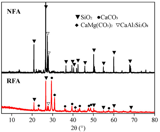 Figure 8 shows the XRD patterns of the two kinds of fine aggregate. RFA primarily consists of SiO2, CaCO3 and CaMg(CO3)2, while NFA is mainly composed of SiO2. The CaCO3 and CaMg(CO3)2 are introduced by the natural coarse aggregate existing in RFA, corresponding well with the CT images (Figure 7). Meanwhile, there is a small amount of CaAl2Si2O8 in both aggregates.