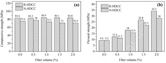 Comparison of strength between R-HDCC and N-HDCC: (a) Compressive and (b) Flexural.