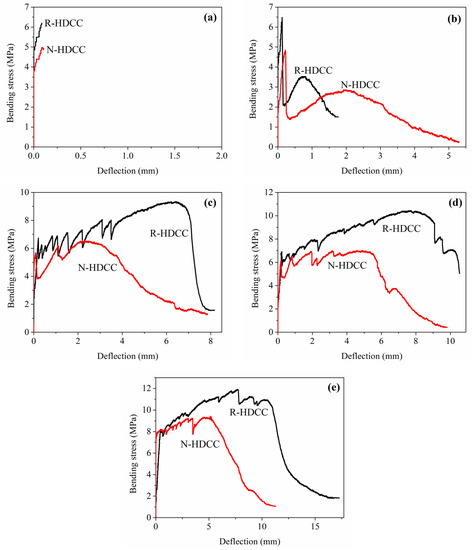 Bending stress versus deflection of R-HDCC and N-HDCC: (a) Vf = 0, (b) Vf = 0.5%, (c) Vf = 1.0%, (d) Vf = 1.5% and (e) Vf = 2.0%.