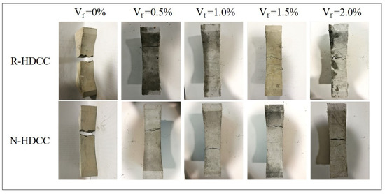 For specimens with Vf ≥ 1.0%, R-HDCC failed with multiple cracking and exhibits an observable deflection hardening; however, this phenomenon of N-HDCC is less remarkable, as shown in Figure 10c–e and Figure 11. Most of the fibers are pulled out and the whole failure process develops as follows: the stress increases in proportion to the deflection until the first crack appears, and continues to increase up to the first peak point, then it drops slightly and immediately rises again through the fiber bridging effect. Once the stress exceeds the matrix cracking strength, new cracks will appear and the stress will decrease slightly again. This process is repeated until the microcracks are saturated. Subsequently, the number of cracks no longer increases, but the width continues to increase. Finally, a localized crack opening occurs at one of the weak sections and the stress decreases continuously, causing the failure of the specimen.