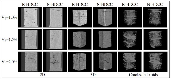 The tensile stress-strain curves of R-HDCC and N-HDCC with Vf varying from 0% to 2.0% are presented in Figure 12a–e, and the failure modes of specimens are displayed in Figure 13. After the tensile test, the defects including cracks and voids in the gauge length of specimens with Vf = 1.0%~2.0% were scanned by CT, as shown in Figure 14. The tensile properties calculated according to stress-strain curve are listed in Table 6.