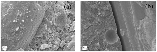 In order to confirm the inferences in mechanical analysis, the interfacial transition zones between aggregate and cement paste, fiber and matrix in R-HDCC and N-HDCC were investigated through SEM after tensile test. As shown in Figure 15, there is nearly no space between RFA and cement paste, while there is an obvious gap between NFA and cement paste, which indicates a tighter RFA/cement paste interface of R-HDCC, corresponding well with the explanation for compressive strength. Moreover, as shown in Figure 16, after being pulled out from R-HDCC, the fibers presented a rough surface with a large amount of hydrated product. Meanwhile, the fibers were so seriously damaged that the surface filaments were stripped and remained in the holes during pull-out, whereas the surfaces of the fibers pulled out from N-HDCC were relatively smooth with few abrasions. This shows that the bond between fibers and matrix in R-HDCC is higher than that in N-HDCC, which shows an agreement with the inferences in bending and tension. All the test results effectively demonstrate that R-HDCC exhibits better mechanical properties than N-HDCC.