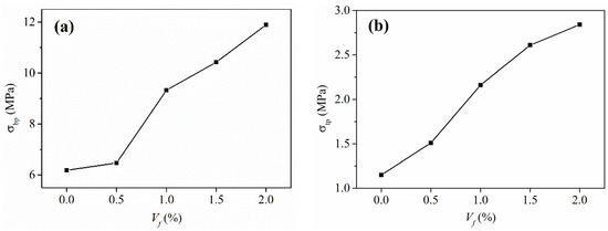 Effect of fiber volume fraction: (a) bending peak stress and (b) tensile peak stress.