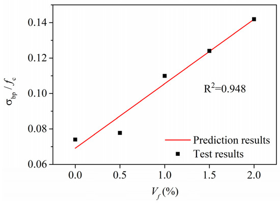 From the experimental results shown in Figure 18, the value of σbp/fc of R-HDCC linearly increases with the increase in Vf, thus the relationship between σbp/fc and Vf can be modelled by linear fitting and expressed as Equation (5). The solid line of Equation (5) in Figure 18 shows good agreement with the test results with R2 = 0.948.