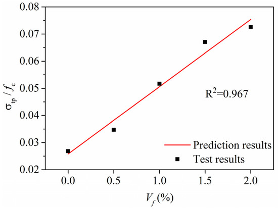 The value of σtp/fc of R-HDCC also linearly increases with the increase of Vf as shown in Figure 19. The relationship between σtp/fc and Vf is modelled by linear fitting and expressed as Equation (6). The solid line of Equation (6) in Figure 19 shows good agreement with the test results with R2 = 0.967.