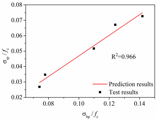 In addition, the values of σbp/fc also show a good linear relationship with σtp/fc, as shown in Figure 20 and modelled as Equation (7). The solid line of Equation (7) in Figure 20 shows good agreement with the test results with R2 = 0.966.