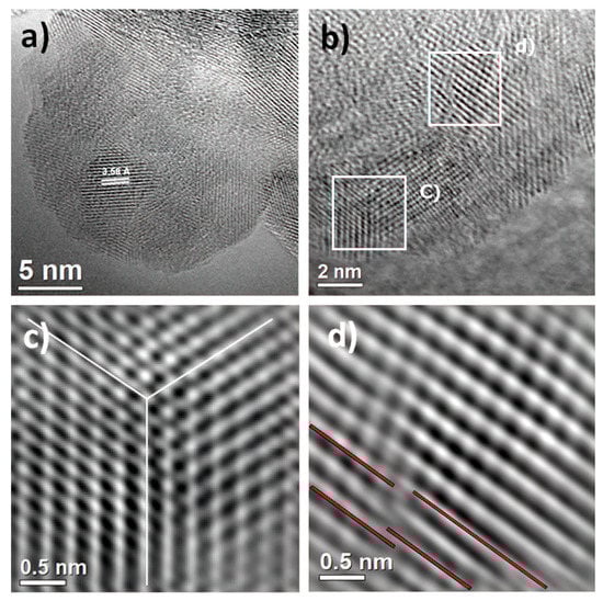 To establish the correlation between the XRD pattern and FESEM analysis, electron irradiation and imaging of the as-prepared sample were carried out by HRTEM. These observations at atomic resolution are shown in Figure 3a–d. HRTEM analysis confirms anatase phase formation by sonochemistry. Also, the electron micrograph in Figure 3a shows the formation of crystalline material in nature with the domain in different orientations and, as a consequence, grain boundary formation. The average crystallite size was determined as 5.2 ± 1.5 nm, and the anatase phase was identified in the [101] projection. At the same time, it is necessary to remark that the measured interplanar spacing of the lattice plane was 3.58 Å instead of 3.52 Å. This result could be attributed to the presence of structural defects. In order to avoid any structural interference, such as the Moiré effect, the HRTEM micrograph was extended to the edge of the sample, shown in Figure 3b; in this micrograph, the existence of structural defects is evident, indicated by white boxes. These defects, such as twinning or homophase boundaries, are depicted in Figure 3c, and dislocation generation is presented in Figure 3d. This set of defects generates microstrains in the crystal structure. Thus, the formation of the nucleus and the growth of the nanocrystal is increased due to the direct influence of ultrasonic radiation. However, the reduction of particle sizes intrinsically generates structural defects that stem from the necessity of redistributing internal energy in the material and definitely the cavitation effect during the synthesis method. Therefore, high-resolution electron microscopy supports the evidence of the appreciable broadening and asymmetrical peak reflections in the XRD and FESEM analyses of the as-prepared sample.