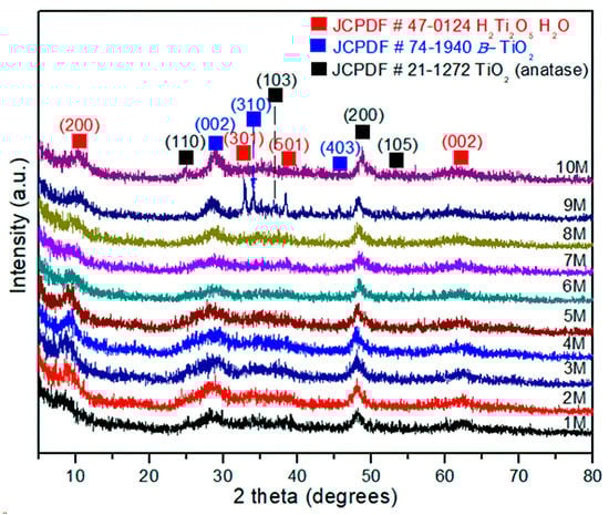 XRD of the TiO2-anatase samples treated with NaOH at concentrations of 1–10 M by the hydrothermal process.