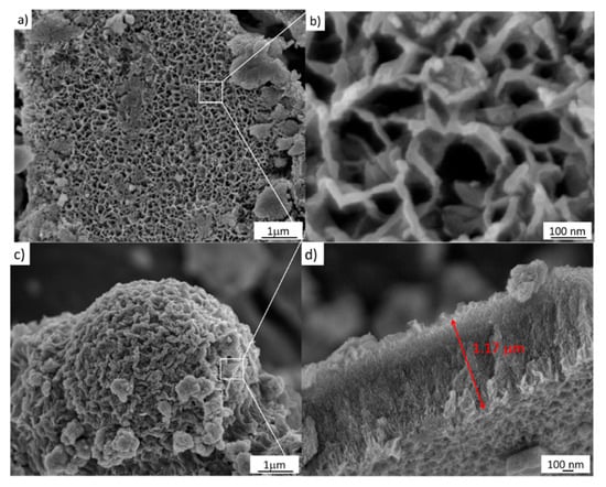 The FESEM image of the sample treated via a simple hydrothermal chemical process at 1 M NaOH is depicted in Figure 5a. Close packing can be clearly seen in this image at the large scale, and a hollow structure with a size around of 100 ± 30 nm is observed, as shown in Figure 5b. Furthermore, the sample also shows a mesoporous structure, also shown in Figure 5c. Moreover, Figure 5c shows the chemical corrosion that occurs using 2 M NaOH as well as a cross-section of the sample. As can be seen, this micrograph depicts oriented nanoarrays grown vertically with an average length of 1 µm, shown in Figure 5d.