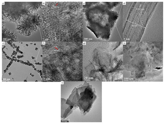 HRTEM images of the samples treated hydrothermally at 110 °C for 24 h. (a,b) 1 M; (c,d) 2 M; (e,f) 3 M; (g) 5 M; (h) 9 M; and (i) 10 M.
