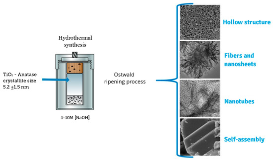 In a typical synthesis, 2.0 g of as-prepared TiO2-anatase sample was mixed in an aqueous sodium hydroxide (NaOH) solution at room temperature until forming a homogeneous suspension. The resulting mixture was simultaneously stirred using a magnetic stirrer. After a few minutes, a turbid white precipitation was formed. Then, the mixture was transferred into a 500 mL Teflon-lined autoclave reactor that was placed in an electric oven. The hydrothermal synthesis was conducted at 110 °C for 24 h. After the processing time, the mixture was allowed to naturally cool down to room temperature. Finally, white precipitates were collected by centrifugation and then washed several times with distilled water and ethanol. The same procedure was applied to different samples of TiO2-anatase using higher concentrations of NaOH in order to elucidate the evolution of TiO2 heterostructures. Throughout this work, a set of acronyms is used: XM, where X represents the concentration of NaOH, from 1 to 10 M. Figure 1 shows a schematic illustration of the process of sonochemical and hydrothermal synthesis.
