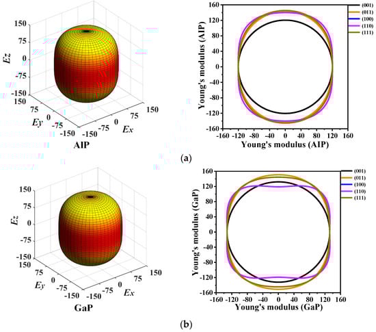 The 3D directional constructions and 2D representations of Young’s modulus E in the (001)-plane, (011)-plane, (100)-plane, (110)-plane, (010)-plane, and (111)-plane for P6422-XP (X = Al, Ga, or In) are shown in Figure 6. Through observation, along with XY-, XZ-, and YZ-plane, P6422-XP (X = Al, Ga, or In) exhibit strong anisotropy in various planes excluding XY-plane. Compared with the XY-plane, the three-dimensional surface structure in the XZ-plane deviates further from the shape of the sphere; therefore, the XZ- plane has stronger anisotropy than the XY-plane [38]. For P6422-XP (X = Al, Ga, or In), the maximum and minimum values of Young’s modulus E are attained in the XZ- and YZ-planes, whereas only the minimum value is attained in the XY-plane because they are isotropic in the (001)-plane. In Figure 6, as Young’s modulus has the same properties in the (100)-, (010)-, and (110)-plane, Figure 6 shows only the two-dimensional curve in the (110)-plane.