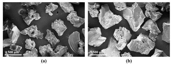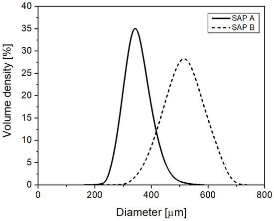 The SAP material used here was a cross-linked sodium salt polyacrylate in the form of a white power produced by bulk polymerization. In order to analyze the effect of SAP particle size on autogenous healing, the SAP powder was classified using sieves (following ASTM E 11) into two particle-size ranges, 300–355 µm and 425–600 µm, which are henceforth referred to as SAP A and B, respectively. The size and type of SAP are ideal to promote the crack self-sealing [20] and autogenous healing [28]. Figure 1 shows the particle-size distribution of dry SAP powders measured using a particle size analyzer (Mastersizer 3000, Malvern Instruments, Worcestershire, UK). Approximately 10,000 SAP particles were measured, and the mean particle size of the dry SAPs was ~343 µm for SAP A, and ~522 µm for SAP B. Figure 2 shows scanning electron microscopy (SEM; S-3400 N, Hitachi, Tokyo, Japan) images of the SAP samples. Both SAP A and B particles were irregular, with similar surface textures, while the larger average particle size of SAP B is clear from the images.