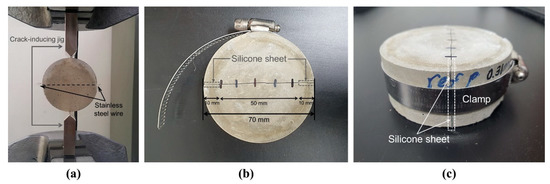 Preparation of the water flow test specimen. (a) MTS 810 with crack-inducing jigs to induce through-crack, (b) crack width control using silicone sheets, and (c) the assembled cracked specimen.
