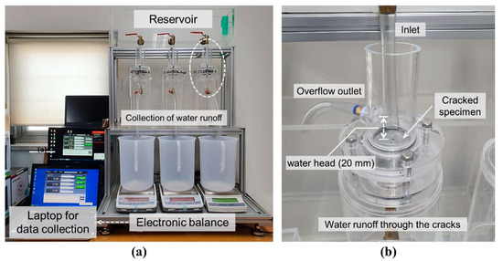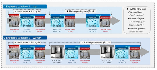 Figure 4 shows the experimental setup for the water flow test. The water flow test was carried out for 28 d in a controlled environment (20 ± 1 °C, 50 ± 1% RH) on the assembled cracked specimens (Figure 3c) after 7 d of standard curing. During the measurement, the water pressure head at the water ingress was provided for the cracked specimens with a height of 30 mm; further, it was maintained uniformly at 20 mm, i.e., the pressure gradient was 0.667 mm/mm, as shown in Figure 4. Distilled water was used for the ingress of water, and the amount of water runoff through the cracks was measured at 5-s intervals over time by using electronic balances and laptops. In order to analyze the effect of the exposure conditions on the autogenous healing after cracking, two different conditions (1 and 2) were imposed on the cracked specimens during the healing period, as shown in Figure 5. The water runoff through cracks per unit time was evaluated in terms of the water flow rate, which in turn was expressed in terms of the water permeability coefficient in existing studies [3,4,5]. The flow rate was measured repeatedly at intervals of 48 h according to the cycle. Condition 1 included 14 healing cycles under water (“wet” samples), wherein each cycle consisted of continuous wetting for 48 h (20 ± 1 °C). Condition 2 consisted of 14 healing cycles as well, but under wet/dry conditions (“wet/dry” samples), wherein each cycle consisted of wetting for 1 h (20 ± 1 °C) and drying for 47 h in a chamber with a controlled environment (20 ± 1 °C, 50 ± 1% RH).