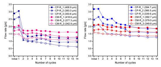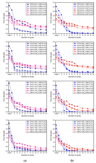 Figure 7 shows the mean and standard deviation of the flow rates (from Figure 6) as a function of the crack width at the initial stage, 1st cycle, and 14th cycle of the water flow tests for each mixture. Figure 8 shows the percentage variation in flow rate, comparing the values shown in Figure 7 for the 1st cycle with the initial values, and comparing the values from the 14th cycle with those from the 1st cycle. The mean flow rates through the CP–R and CM–R specimens increased slightly (up to +5.1%) in the 1st cycle compared to the initial stage, while the corresponding values for the CP–S and CM–S specimens slightly decreased, with a variation in the range of −15.8–23.2% for the CP–S–0.5 and CM–S–0.5 specimens, and −30.7–43.9% for the CP–S–1.0 and CM–S–1.0 specimens. The absolute values of the percentage variation increased with increasing SAP dosage due to enhanced rapid crack self-sealing [18,19,20]. In addition, as shown in Figure 8a, SAP B with the larger particle size showed better rapid crack self-sealing performance under the controlled crack width conditions, which may be attributed to the larger particles being able to swell sufficiently to fill voids, including cracks [18], while SAP A could not swell as much. In addition, due to the differences in crack geometry according to SAP type and SAP shape, the irregular SAP particles used here may exhibit different swelling behavior compared to that of spherical SAPs [18]. Therefore, further studies are required to analyze the swelling behavior of irregularly shaped SAPs in cracks, considering more variables via image analysis, such as cryofracture SEM and X-ray CT analysis.