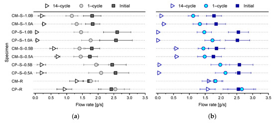 Mean and standard deviation of the flow rates through the water flow test specimens at the initial stage and after the 1st and 14th cycles under (a) wet and (b) wet/dry conditions.