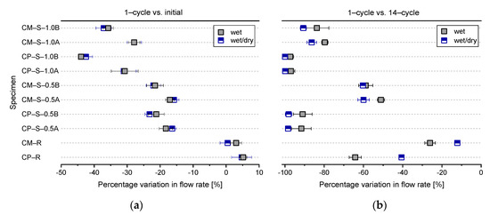 Mean and standard deviation of the percentage variation in the flow rate for the water flow test specimens comparing the values for the (a) 1st cycle with the initial values, and (b) 14th and 1st cycles.