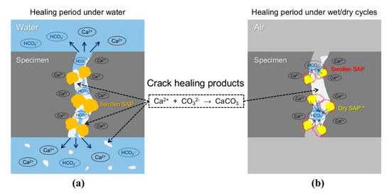 Schematic diagrams showing the mechanisms of autogenous crack healing by SAPs in cracks under (a) wet and (b) wet/dry conditions.