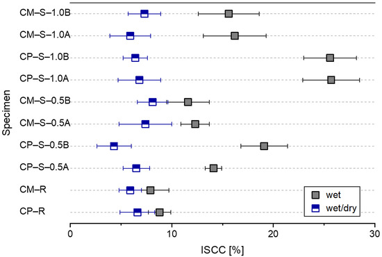 where Wi is the initial mean surface crack width, and Wf is the final mean surface crack width. Hence, this term quantifies the reduction in surface crack width after healing. In order to calculate the ISCC values shown in Figure 12, Wi and Wf values for the water flow test specimens (data shown in Figure 6) were used. The autogenous crack healing efficiency (Figure 6, Figure 7 and Figure 8) and ISSC (Figure 12) were not proportional to each other. As the cracked cementitious materials exposed to wet conditions more easily formed healing products within the surface cracks, the ISCC values of all specimens for each mixture were larger for wet conditions compared to wet/dry ones. The largest ISCC values (26 ± 3%) were observed for the CP–S–1.0A and CP–S–1.0B specimens. No major differences in the ISCC values were observed for the different SAP particles sizes.