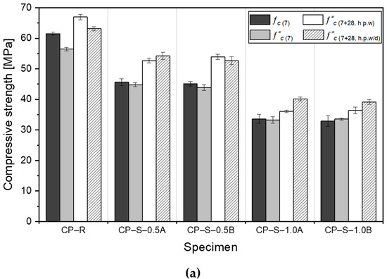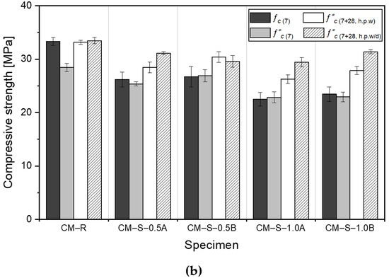 Figure 13 shows the compressive strength of the CP–R, CM–R, CP–S, and CM–S specimens at a curing age of 7 days (f c(7)), immediately after pre-damage (f *c(7)), and after the 28-d healing period under wet (f *c(7+28, h.p.w)) or wet/dry (f *c(7+28, h.p.w/d)) conditions. The experimental results showed that the addition of SAPs, which acted as defects in the cementitious structure, induced a significant decrease in the f c(7) values, where the strength decreases with increasing SAP dosage. The SAP particles formed a large number of voids in the cement matrix when they absorbed water and swelled. Hence, more voids were formed with a greater number of SAP particles, resulting in larger strength drops [18,19]. The strength reduction ratio of CP specimens was higher than that of CM specimens for the same SAP dosage. The f *c(7) values of the CP–R and CM–R specimens decreased slightly compared to the corresponding f c(7) values, while the CP–S and CM–S specimens showed similar f *c(7) and f c(7) values. The CP–R and CM–R specimens had higher initial strength than the CP–S and CM–S specimens due to the dense cement matrix and lack of SAP voids, and were hence more significantly affected by pre-cracking. This was similar to the experimental results of Nardi et al. [39]; they measured the strength of the specimens with/without the self-healing coated granules (which act as defects leading to decrease in strength) at the initial stage and after pre-cracking, where an insignificant difference in the strength was observed for the specimens containing self-healing coated granules.