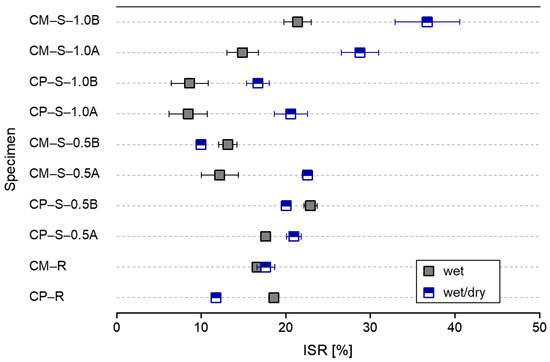Mean and standard deviation of the index of strength recovery (ISR) after the healing period under wet and wet/dry conditions for all test specimens.