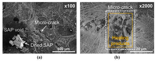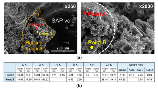 Figure 16 shows the SEM images of the internal crack surface of an SAP-containing sample after completion of the water flow test under wet/dry conditions. Healing products are clearly visible within the microcrack near the SAP void. As the SAP particles were subjected to repeated swelling/shrinkage under wet/dry conditions, the SAP particles exposed to cracks, which have access to incoming water during wet conditions, repeatedly swelled and supplied water to the nearby crack surface during the dry cycle, improving autogenous crack healing by promoting the formation of healing products. Although other studies have indicated that some SAPs remain physically bonded to the surrounding cement matrix [18] and that there is an interaction between the SAPs and cement that affects the swelling behavior of SAPs [20,41], an analysis is necessary to elucidate the mechanism of the chemical reactions between SAPs and healing products in cementitious materials.