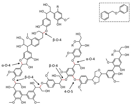 Lignin has a complex molecular structure that mainly consists of phenylpropanoid units, i.e., coumaryl, coniferyl and sinapyl alcohols [8]. Other building blocks such as ferulate, p-coumarate, hydroxycinnamaldehyde, etc. are typically incorporated to a lesser extent. Several different types of linkages connect the monomers via ether bonds and/or carbon-carbon bonds (C–C). The former (e.g., β-O-4, α-O-4, 4-O-5, in Figure 1), typically, predominate in native lignin and are significantly weaker than the C–C bonds, making the cleavage of the Caryl–O bonds an interesting approach for lignin depolymerization. Although most current technical lignins show a significantly lowered amount of ether bonds, in favor of C–C linkages, due to the severe conditions applied during lignin extraction, it is expected that the emerging biorefinery concept will shift towards milder lignin isolation techniques, which prevent the non-selective ether bond scission [8,9,10,11]. Model compounds, resembling native ether linkages in lignin have been used extensively in literature to assess the performance of catalysts in the depolymerization and to get in-depth insights into the occurring reaction pathways [12,13,14,15,16,17]. In this work, the performance of synthesized catalysts for the reductive depolymerization of lignin is assessed through benzyl phenyl ether (BPE), a model compound resembling the α-O-4 ether linkage and commonly used throughout the literature (see Figure 1, top right) [15,16,18].