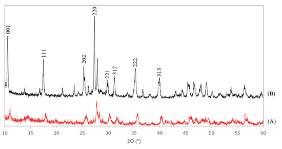 XRD patterns of the benchmark scale Ce-LDH (A) and the scaled-up Ce-LDH with Miller indices appointed to the reflections (B).