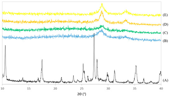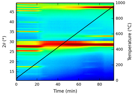 X-ray diffraction patterns, as a function of temperature, were recorded up to 1000 °C and the resulting two dimensional mapping is presented in Figure 7. At low temperatures, the XRD pattern corresponds to the XRD pattern as depicted in Figure 3, showing the reflection at 17 °C, indicative of the Ce-LDH structure. However, starting at 220 °C, the dehydroxylation reaction initiates, as experimentally demonstrated by the TGA results in Section 3.1.5. Hence, due to the degradation of the actual hydroxide layers, the characteristic Ce-LDH peaks (e.g., at 17°) disappear. At temperatures above 800 °C, the characteristic peaks of CeO2 (JCPDS Card: 043-1002) have fully formed (i.e., at 28.5°, 33° and 47.5°, respectively corresponding to the following Miller indices 111, 200 and 220) [68,69], indicating the complete degradation of Ce-LDH to CeO2. This is also confirmed in literature as Ce2O2SO4, Ce(SO4)2 and Ce2(SO4)3 fully degrade to CeO2 at similar temperatures [65,66,67].