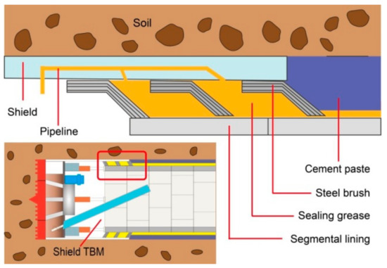 More specifically, during the construction of an underground tunnel, there will be an annular space between the shield tail of the shell and segment lining, as shown in Figure 1. At present, a brush seal has mainly been adopted for the annular space of TBMs [4,5]. Generally, there are three or four rounds of steel brushes installed in the annular space filled by the sealing grease. The sealing grease is a necessary material to seal the gap between the shield shell and the segment, and to prevent cement slurry or groundwater from entering the working space through the annular space. If the seal fails, the pressure of the backfill grouting will be insufficient, causing settlements at the ground surface and potentially even a collapse [6,7]. In addition, the sealing grease adhering to the outside of the concrete segments also has a sealing effect on the cracks between the concrete segments. The sealing grease and grouting material wrapped around the concrete segments remain underground permanently.