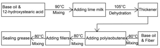 The base oil of sealing grease is usually mineral oil. Its main component is polymer hydrocarbon. Mineral base oil is a type of non-renewable resource, and could cause pollution in production, processing, and application [15,16]. Some studies have tried to use degradable vegetable oil and its derivatives to replace mineral oil in preparing lubricating grease [17,18,19,20], but studies regarding using renewable oil in sealing grease have not been reported. Sealing grease is buried under the ground permanently after use. To avoid polluting the groundwater, it should be environmentally friendly. In this study, vegetable oil and lard were used as the base oil to make sealing grease, and can therefore improve the environmental performance of the sealing grease.