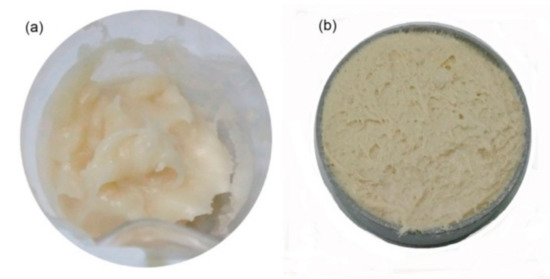 The manufacturing process of the sealing grease is shown in Figure 2. In the saponification, the mass ratio of calcium hydroxide (A.R.), 12-hydroxystearic acid, and base oil was 1:7:12, meaning an excess of calcium hydroxide. First, the base oil and 12-hydroxystearic acid were added to a beaker and heated up to 90 °C, at which time the 12-hydroxystearic acid had melted. Next, lime milk made of deionized water and calcium hydroxide with a concentration of 5 wt % was poured into the beaker, and stirred until the water became clear. After stirring, the water was poured out and the thickener was heated to 105 °C to remove the water until there were no more bubbles. Meanwhile, the wood fiber, base oil, and polyisobutylene were mixed in a beaker. The thickener was added to the beaker after the mixture was uniform. In the final steps, fillers were added to the mixture and mixed. The sealing grease sample was prepared at that time. If not specified, the temperature of each step above was 80 °C in a water bath. The images of the thickener and sealing grease are shown in Figure 3.