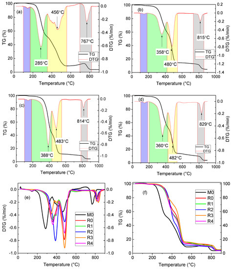TGA results of thickener and base oil mixture: (a) M0; (b) R0; (c) R2; (d) R4; (e) DTG curves for all samples; (f) Thermogravimetry (TG) curves for all samples.