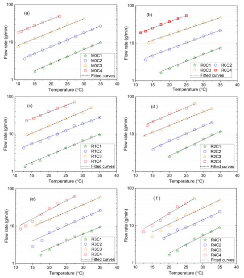 The fitting results are shown in Figure 7 with dotted lines. The test results of sealing grease samples are well fitted to the function, and the correlation coefficient of M0C2 is 0.9994. The test results of samples R3 and R4 in the low temperature area deviate from the fitting curve. The fitting correlation coefficient of sample R3C4 is 0.9796, and is the smallest one. It can be seen from Figure 6 that the higher the base oil ratio in the sealing grease, the higher the flow rate will be. For example, with the sample R1 series sealing grease at the certain temperature of 25 °C, the flow rate of the sample R1C1 is 4.25 g/min. When the base oil content increased by 2.5%, the flow rate of R1C2 was 12.31 g/min, increasing by a multiple of 1.9. The results show that the content of base oil is the main factor affecting the fluidity of the seal grease. Without considering the influence of temperature, the regression coefficient b is the main parameter to determine the flow rate. Regression coefficient a indicates the sensitivity of the sealing grease flow rate to temperature. The greater the value of a, the greater the influence of temperature on the flow rate of the sealing grease. Considering that the environment for sealing grease is a normal temperature, the flow ability tests were carried out from 10 °C to 35 °C. When the temperature is above 35 °C, the fitting function may not be applicable.