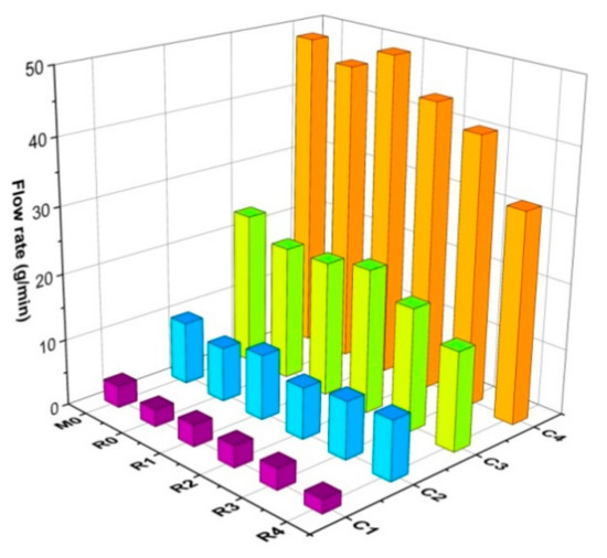 To evaluate the impact of the content and type of the base oil on the fluidity of the sealing grease, the flow rate of all samples at 22.5 °C is shown in Figure 8. In the figure, it can be seen that the flow rate increased rapidly with the increase of base oil content. For example, when the base oil content increased from 15% to 22.5%, the flow rate of the R0 series samples increased from 2.6 g/min to 45.7 g/min, an increase by a multiple of approximately 18. Therefore, it can be concluded that the rheological properties of the sealing grease mainly depend on the content of the base oil.