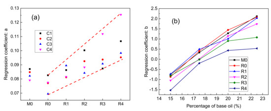 As mentioned above, the regression coefficient a represents the sensitivity of the sealing grease flow rate to temperature. The greater the coefficient a, the more sensitive the flow rate to the temperature. Under the influence of weather, tunnel depth, ventilation, and other factors, the operating temperature of the sealing grease will change. Therefore, the lower the temperature sensitivity of the sealing grease, the better the safety of the shield tunnel construction. The relation between regression coefficient a and sealing grease type is shown in Figure 9a. It can be concluded that the temperature sensitivity of sealing grease is related to the type of base oil. The temperature sensitivity of M0 is higher than that of R0. This proves that the sealing grease prepared with vegetable oil has better temperature stability than that prepared with mineral oil. The regression coefficient a of R0 to R4 gradually increases, and the temperature stability gradually decreases. The percentage of lard in the base oils from R0 to R4 increased from zero to 40%. Therefore, the increase of temperature sensitivity coefficient may be related to the increase of the lard content in the base oil. Lard is solid at room temperature, and melts into liquid at approximately 30 °C. As a result, lard increases the sensitivity of sealing grease to temperature.