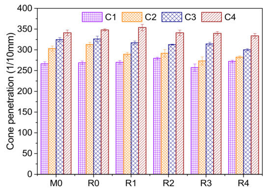The cone penetrations of sealing grease were tested at 25 ± 0.2 °C. Each sample was tested three times. The average values and standard deviation of cone penetration were calculated as shown in Figure 10. The test results show that the cone penetration increases with the increase of base oil content. This indicates that the higher the base oil content, the softer the sealing grease will be. The statistical analysis of cone penetration shows that base oil content increased by 2.5%, and the sealing grease consistency increased by 2.46 mm on average. The cone penetration of M0 series sealing grease is close to that of R-series sealing grease. The liquid base oil among the fillers has a lubrication effect which can decrease the particle friction and shear stress. Therefore, increasing the base oil in sealing grease will lead to the increase of cone penetration. The cone penetration of sealing grease is generally 200(1/10 mm)–260(1/10 mm). If the cone penetration is too large, the grease pressure in the shield tail will be low and may lead to leakage.